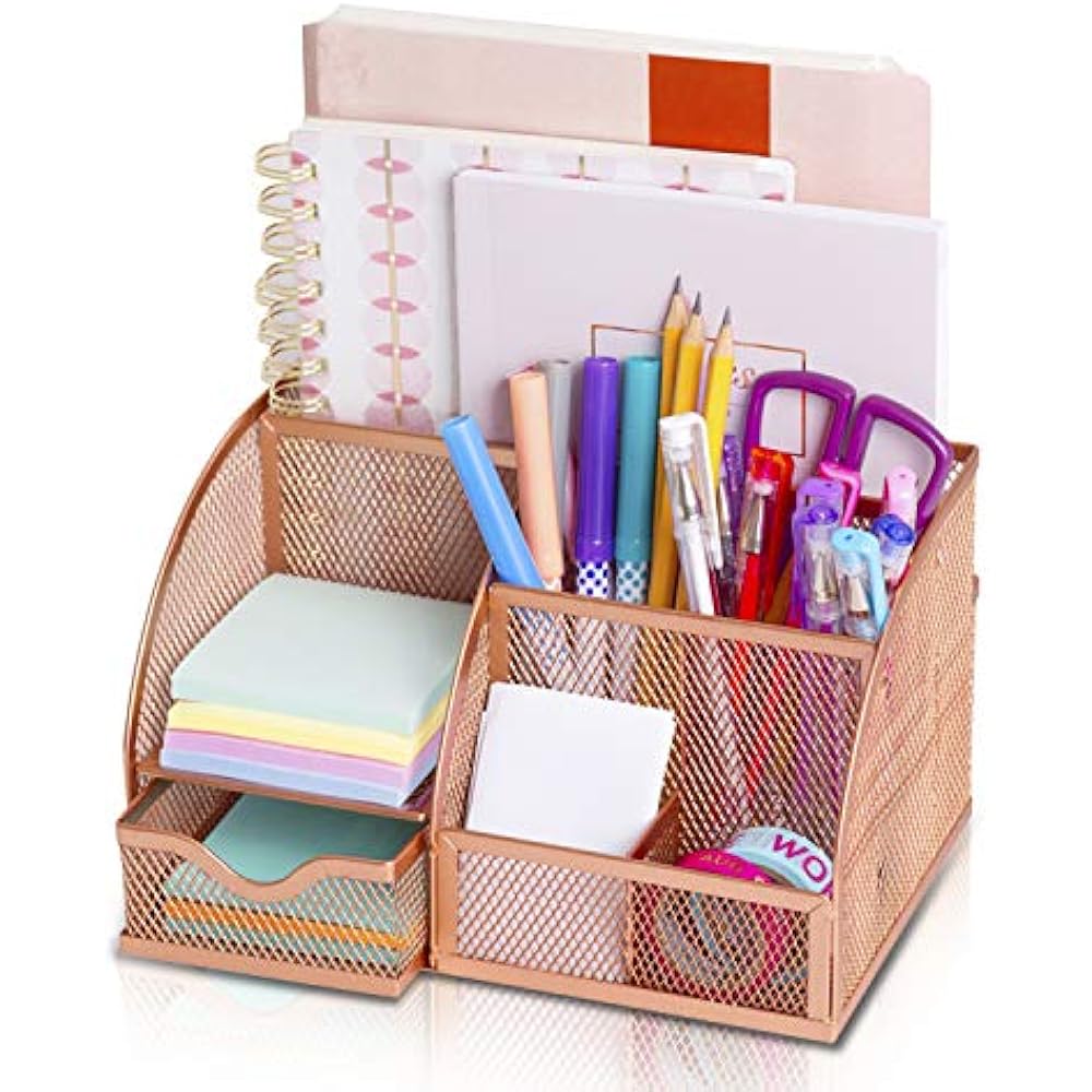 The original rose gold desk organizer comes with 6 differently shaped and sized compartments, aswell as a cute little drawer, all intended for any use from pens to notebooks.